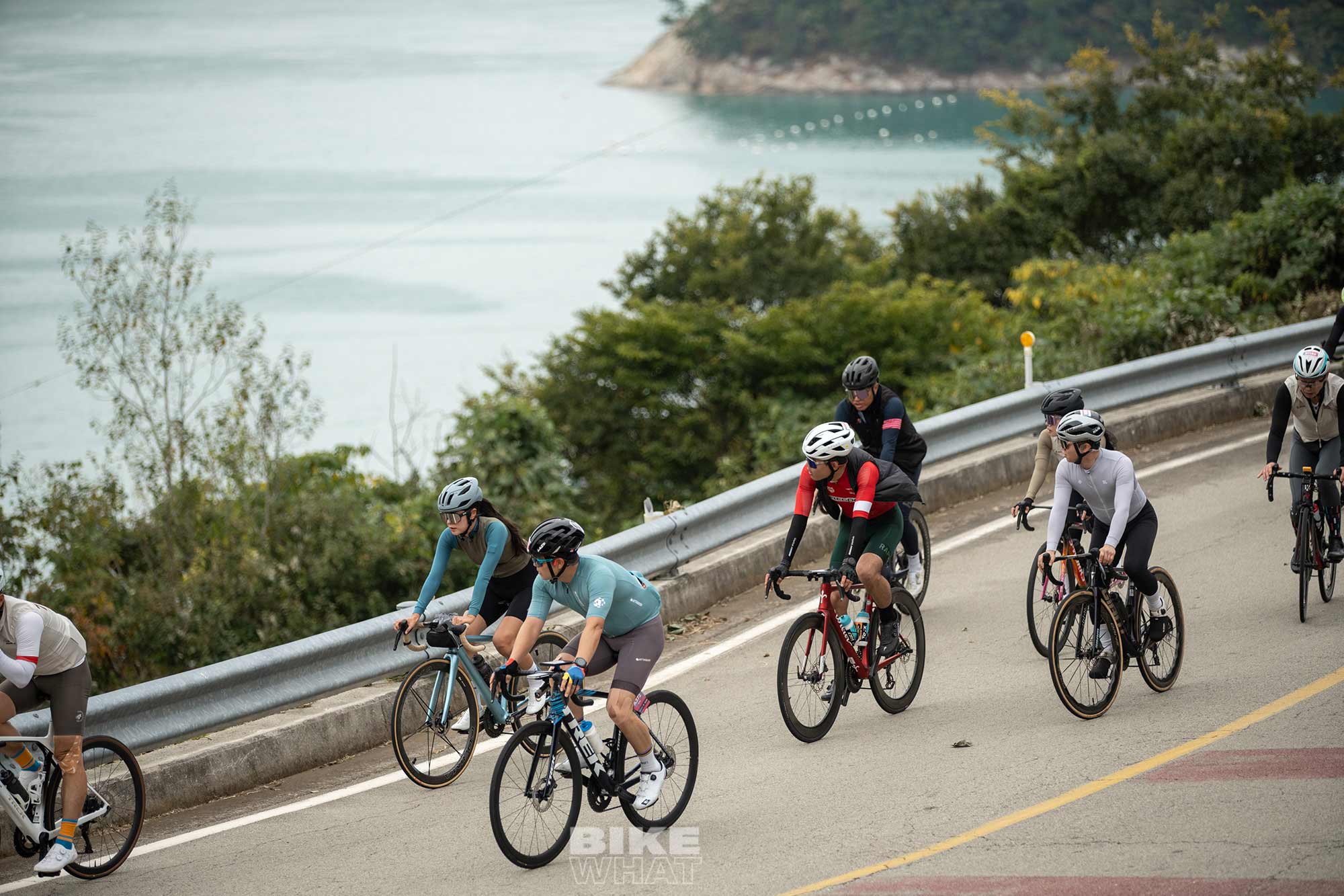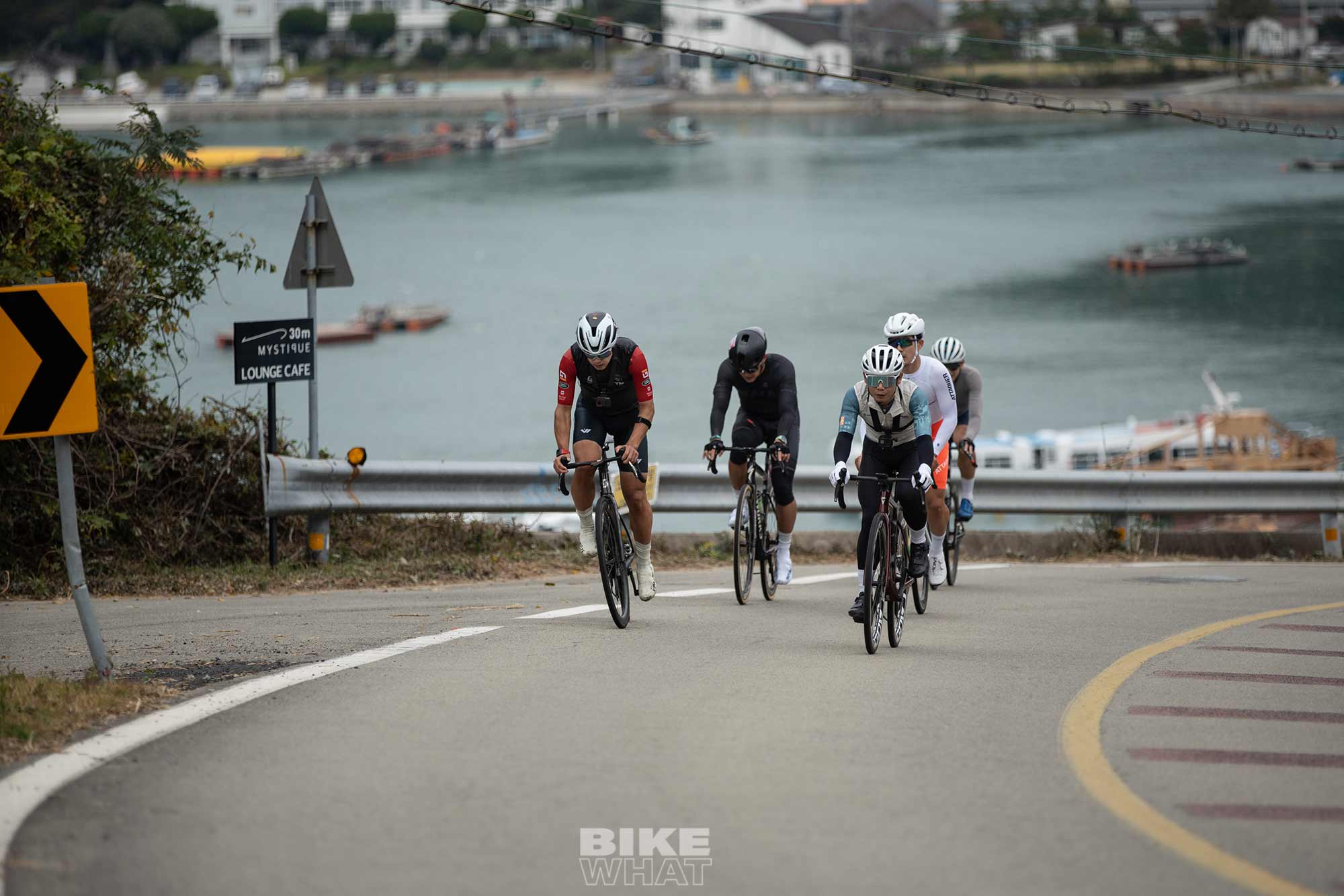 통영 트라이애슬론 광장으로 돌아오는 97㎞ 코스지만, 92.4㎞ 지점인 한신마리나호텔 입구에서 계측이 종료된다. 남은 구간은 삼칭이해안길을 이용해 복귀하게 되는데, 바다와 맞닿은 자전거도로이자 코스에서 유일한 평지구간이어서 계측을 마친 라이더들이 경치를 즐기며 쉴 수 있었다.