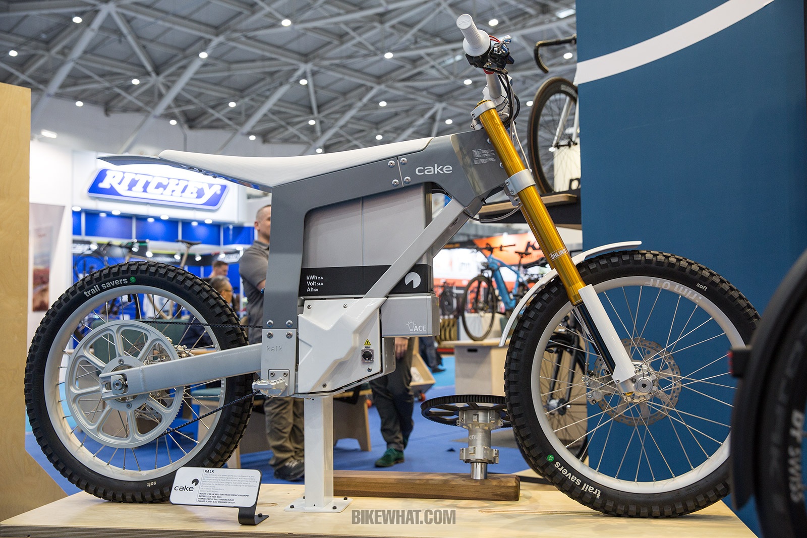 스웨덴의 전기모터사이클업체 케이크(Cake)의 E모터크로스 바이크, 칼크(Kalk). 11kW 모터와 2.6kWh 리튬 이온 배터리를 사용해 최고속도 75㎞/h, 최대 주행거리는 80㎞다. 건조중량은 53㎏이고, 배터리 17㎏을 더하면 70㎏이 된다. 게이츠 카본 드라이브로 동력을 전달한다.