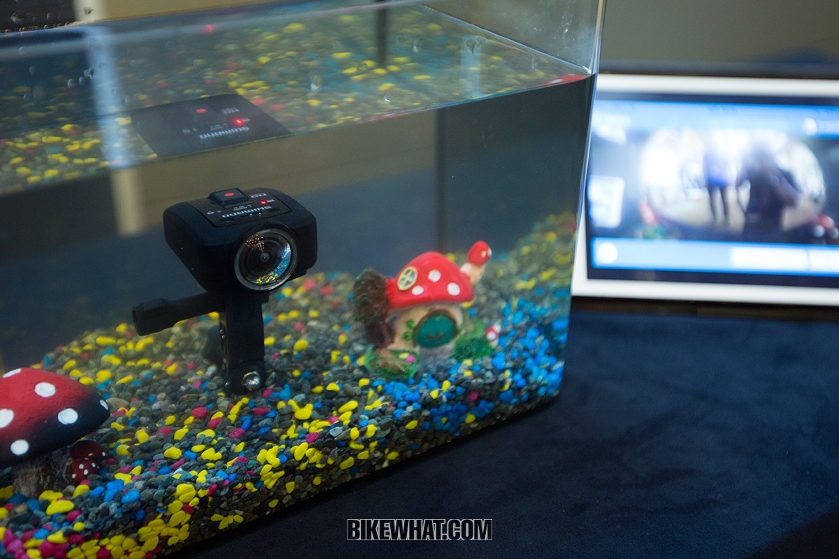 시마노의 첫 스포츠 카메라 CM-1000(■연관기사 : 시마노 스포프캠 CM-1000)은 별도의 하우징 없이도 10m까지 방수가 되는 점을 강조하기 위해 어항 안에 카메라를 넣어 전시한 뒤, 내장된 와이파이로 태블릿에 연결해서 수중에서 촬영하고 있는 실시간 영상을 확인할 수 있도록 했다. CM-1000은 1080p(30f), 720p(120f), 360p(240f)로 영상을 저장할 수 있으며, F2.0의 밝은 렌즈를 써서 낮은 조도에서도 좋은 화질을 기대할 수 있다. 방수기능을 위해 배터리는 카메라 안에 내장되어 있으며, 1회 충전으로 약 2시간 동안 촬영이 가능하다.