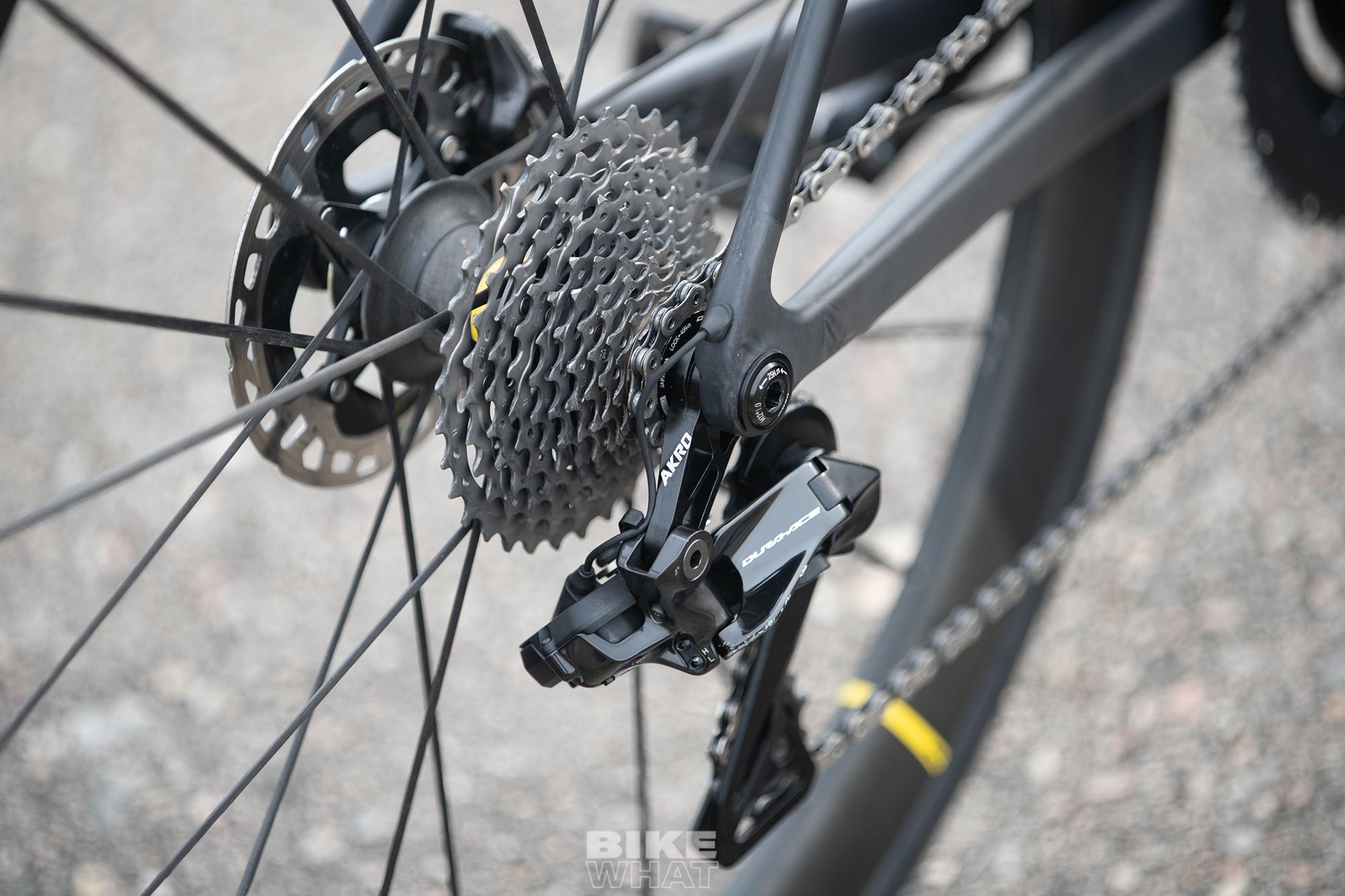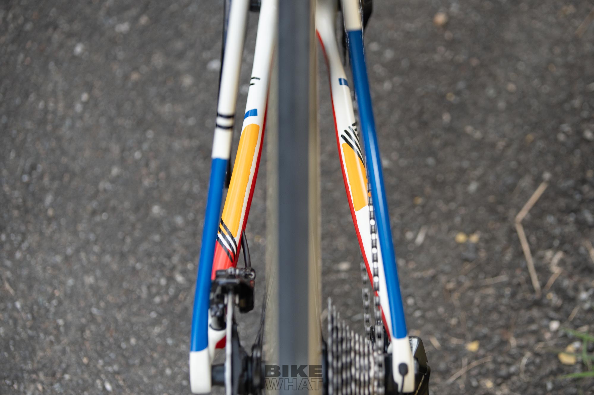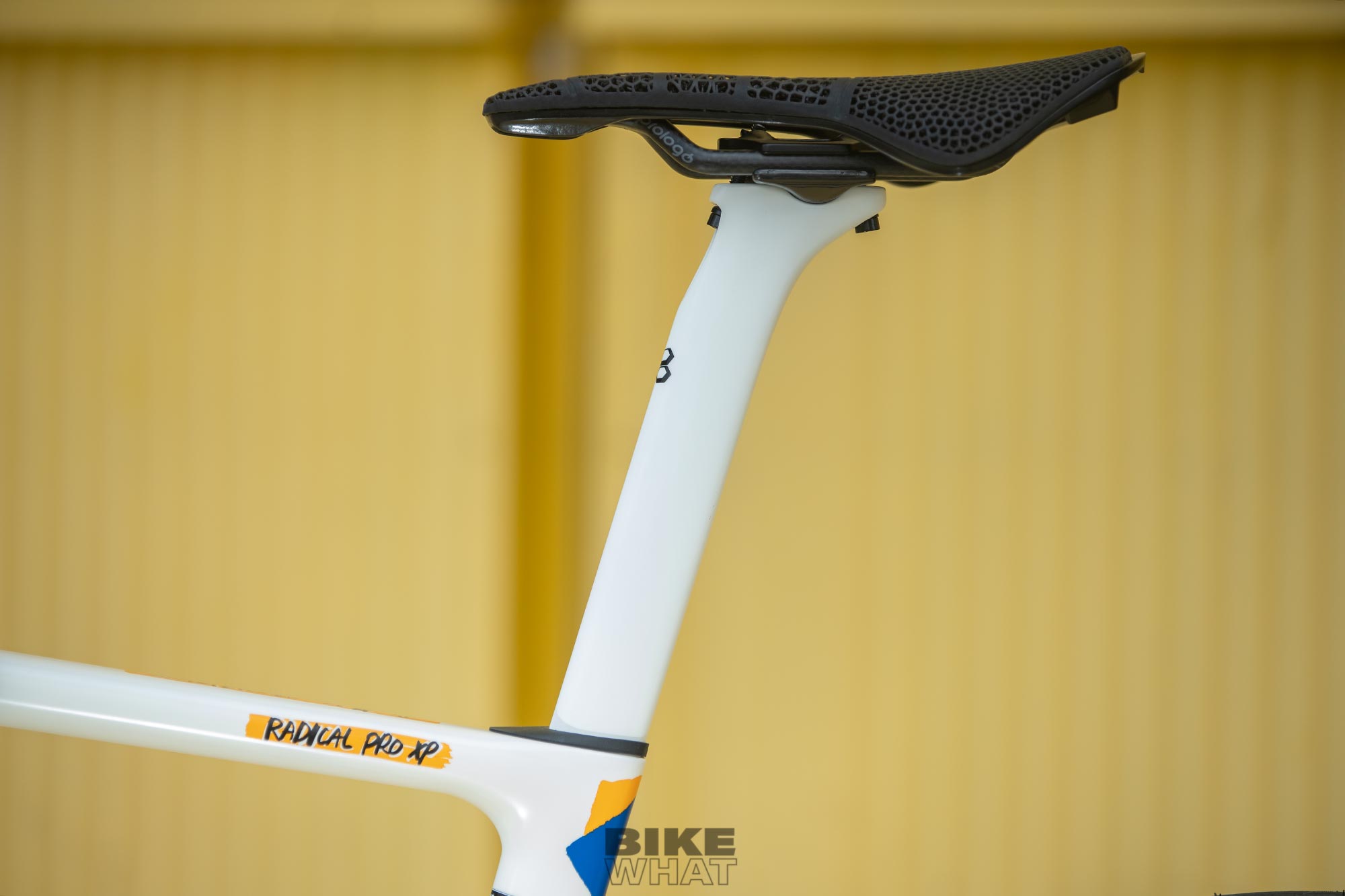 래디칼 2에 채택된 슬로핑 탑튜브는 스탠드오버와 프레임의 무게 중심이 낮아지는 효과가 있는데, 시트포스트를 길게 뽑을 수 있어서 승차감 개선에도 도움을 준다. 정밀한 카본 레이업으로 완성된 후삼각과 시트포스트 그리고 좌우로 넓어진 시트스테이가 만나 래디칼 1 대비 승차감이 크게 개선되었고, 최대 35C 타이어까지 사용 가능한 넓은 타이어 클리어런스는 차후 더 넓은 림 폭을 가진 휠셋과 타이어 장착이 가능하다.