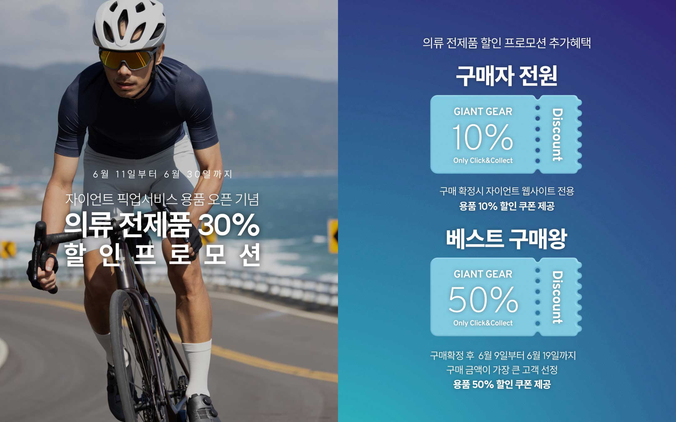 ‘자이언트(Giant)와 리브(Liv) 웹사이트 용품 카테고리 오픈 기념 의류 30% 할인 프로모션’은 6월 11일부터 30일까지 이어지며, 이벤트 기간 내 구매 확정 고객 전원에게 10% 용품 할인 쿠폰이 지급된다. 행사 기간 동안 최고 구매액을 기록한 1인에게는 50% 용품 할인 쿠폰이 주어질 예정.